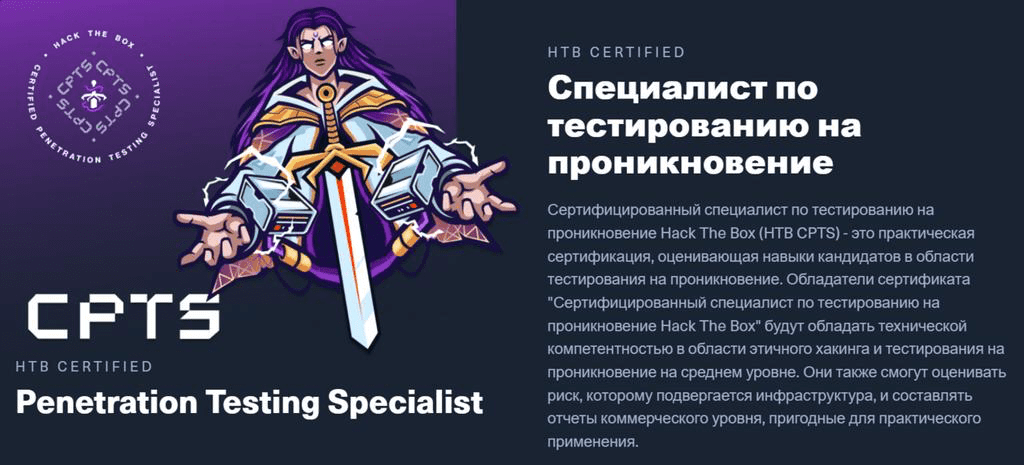 Сертифицированный специалист по тестированию на проникновение Hack The Box (HTB CPTS) - это практическая сертификация, оценивающая навыки кандидатов в области тестирования на проникновение. Обладатели сертификата "Сертифицированный специалист по тестированию на проникновение Hack The Box" будут обладать технической компетентностью в области этичного хакинга и тестирования на проникновение на среднем уровне. Они также смогут оценивать риск, которому подвергается инфраструктура, и составлять отчеты коммерческого уровня, пригодные для практического применения.