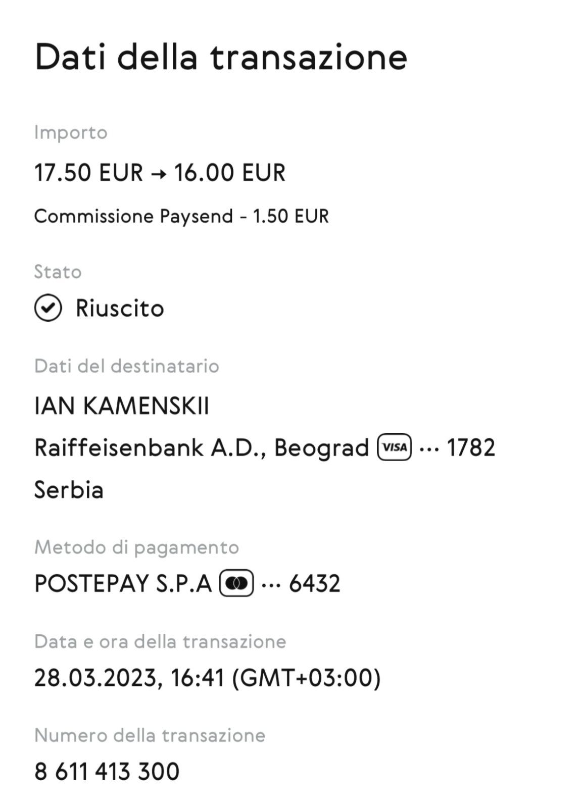 Добрый день, сделала мгновенный перевод на карту, 28.03.2023 в 16:41 на сумму 16 евро. Жду подтверждения. Спасибо Посмотреть вложение 63105