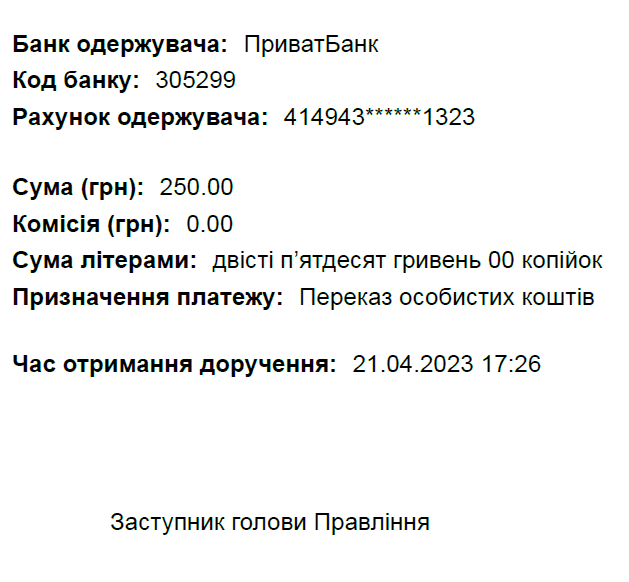 главбух написал(а): Посмотреть вложение 61234 Оплатить премиум и премиум клуб можно с помощью перевода на карту украинского банка Приват. Реквизиты: Стоимость премиума - 450 рублей, стоимость премиум клуб - 900 рублей. Оплачивать по курсу на момент оплаты. После оплаты в комментариях в этой теме укажите точную дату, время оплаты и сумму. Если в квитанции указаны ФИО получателя, просьба - их замазать. После ручной проверки, вам будет выдан доступ. Нажмите для раскрытия... 21.04.23, 22.35 по укр времени